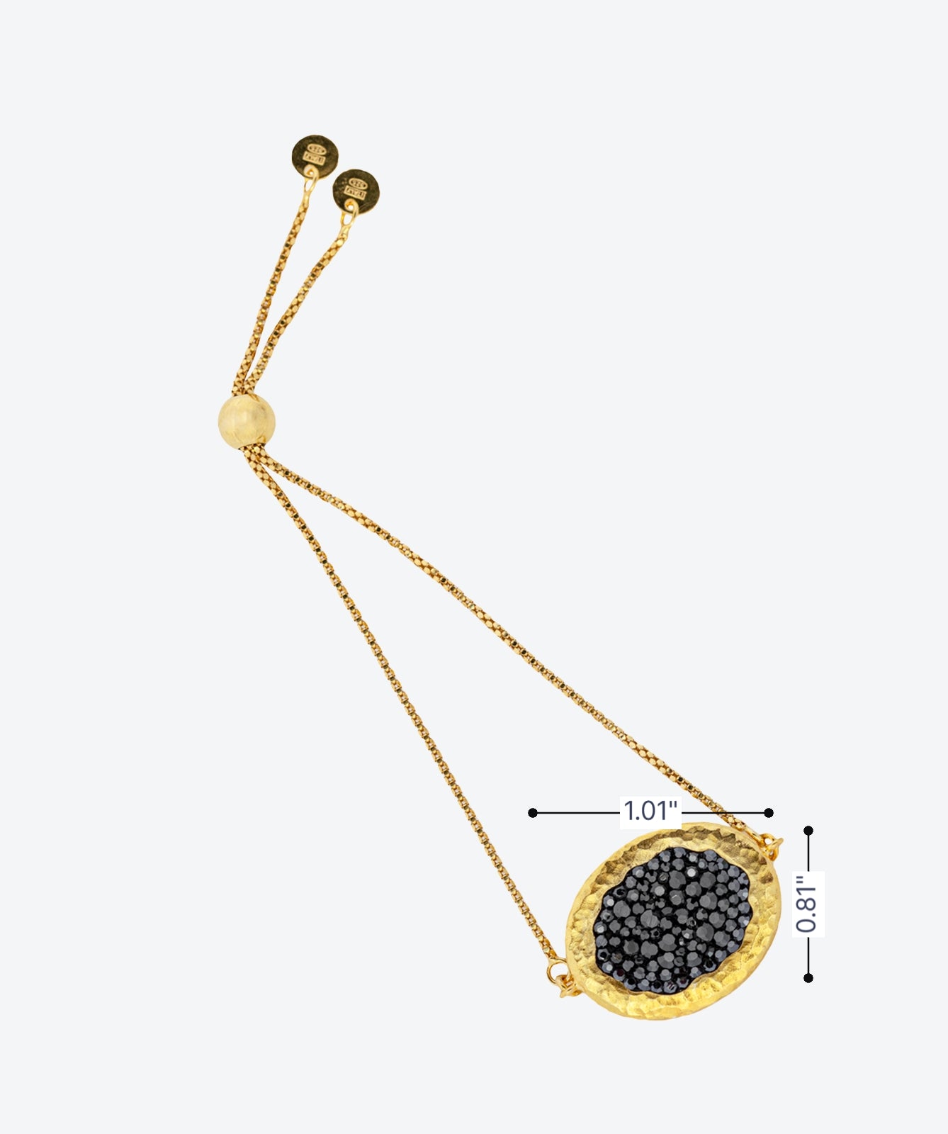 Capture timeless elegance with our Geode Slide Bracelet. This luxury jewelry piece showcases a mesmerizing cluster of sparkling Swarovski® crystals at its center, evoking the intricate beauty of a natural geode. 1 The unique hammered finish adds a touch of rustic charm, while the overall design exudes an aura of sparkling opulence. Handcrafted by skilled European artisans, this bracelet features a sliding design for adjustable comfort. This handcrafted bracelet is perfect for adding a touch of unique, crystal cluster opulence to any ensemble. Elevate your style with this artisanal masterpiece.