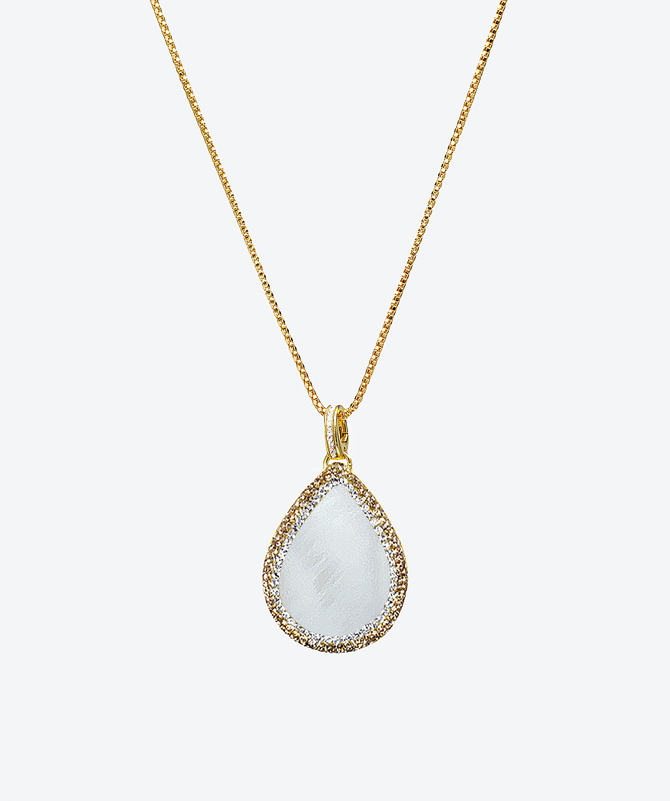 The stone’s graceful contour is delicately framed by a triple-tiered border of small, sparkling crystals. These three concentric rows enhance the teardrop silhouette, adding a voluminous and luxurious glimmer that contrasts beautifully with the earthy center. Perfect for those who seek luxury jewelry with character, this pendant balances bold structure with refined detail. Add a touch of brilliance to your neckline and make this sophisticated charm your new signature accessory.
