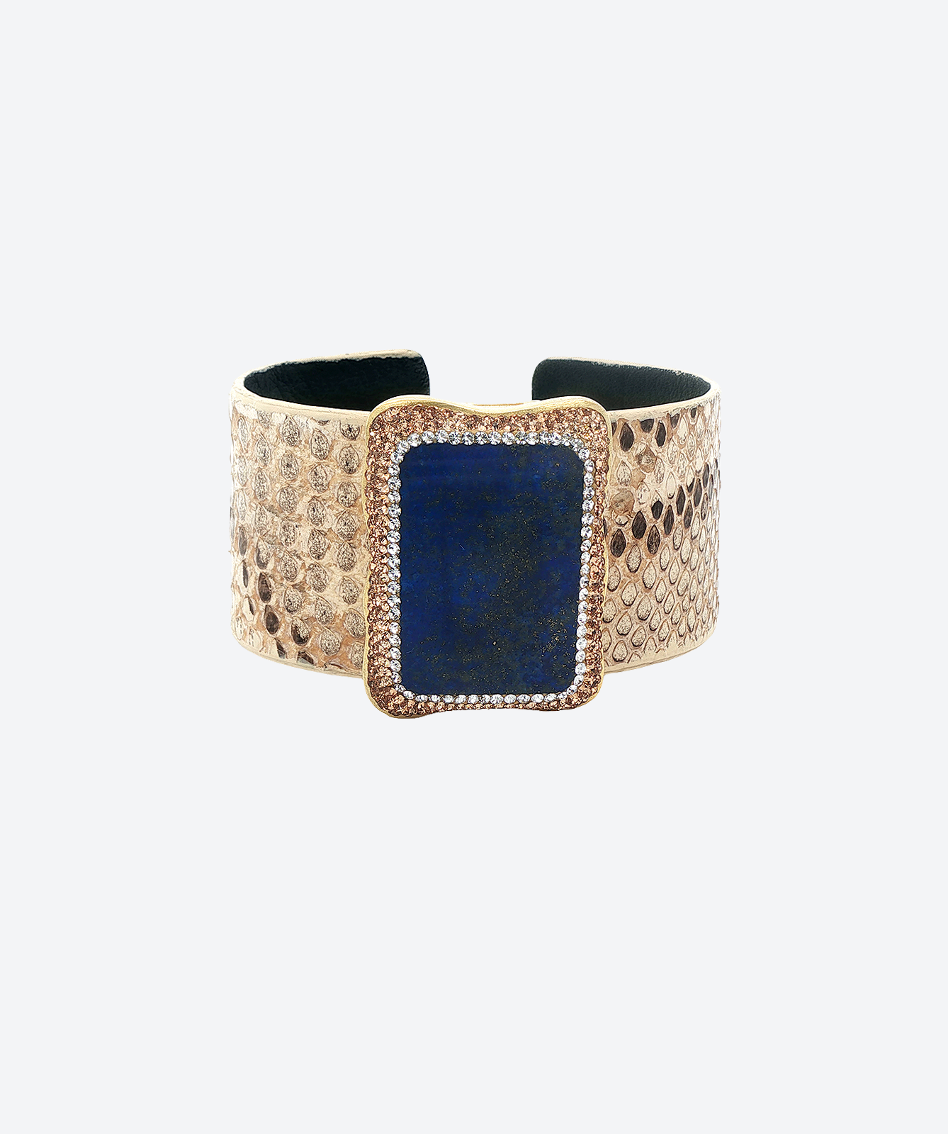 Capture bold elegance with our Exotic Gem Cuff. This luxurious piece features a glamorous exotic leather band, centered with a striking rectangular gemstone, framed by sparkling crystals. The unique texture of the leather contrasts beautifully with the brilliance of the gemstone and surrounding crystals, creating a piece that exudes opulence. Handcrafted with meticulous attention to detail, this cuff is perfect for adding high-end glamor to any ensemble.