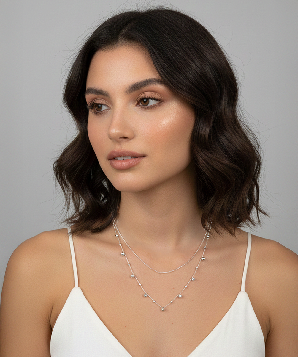 This dainty 2 layer droplet necklace is perfect for adding a little style to your  leisure wear. It comes in bright silver, black rhodium silver, and 18k Gold plated silver.