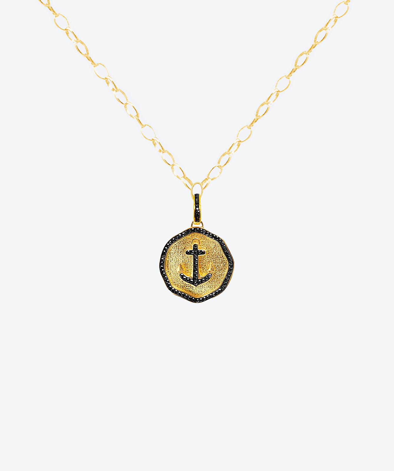 The medallion's unique, organic-edged contour is beautifully framed by a single row of small, brilliant dark crystals, creating a precise halo that enhances its distinctive shape and provides a ring of bold luminosity. The elegant bail, also adorned with brilliant crystals, connects the pendant to a chain of open, lustrous links. This piece elevates to the realm of true luxury jewelry. Meaningful and stylish, this necklace allows you to capture timeless elegance while keeping a reminder of adventure and security close to your heart.