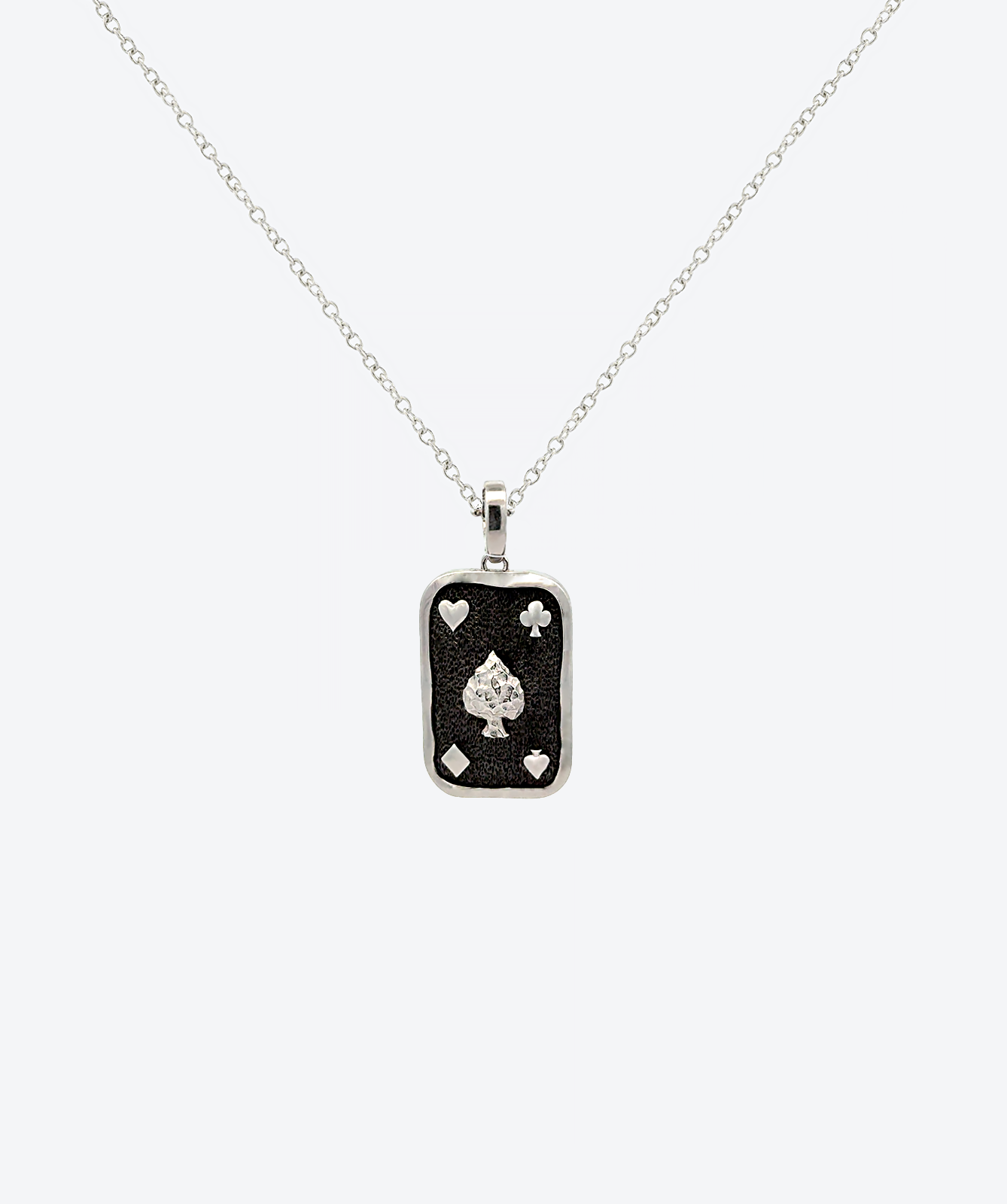 Make a bold statement with our Spade Medallion Necklace, a tribute to sharp style and elegant design. This handcrafted artisan necklace features a striking rectangular medallion that forms the iconic spade symbol from a deck of cards. This piece perfectly blends a classic motif with modern, geometric lines.