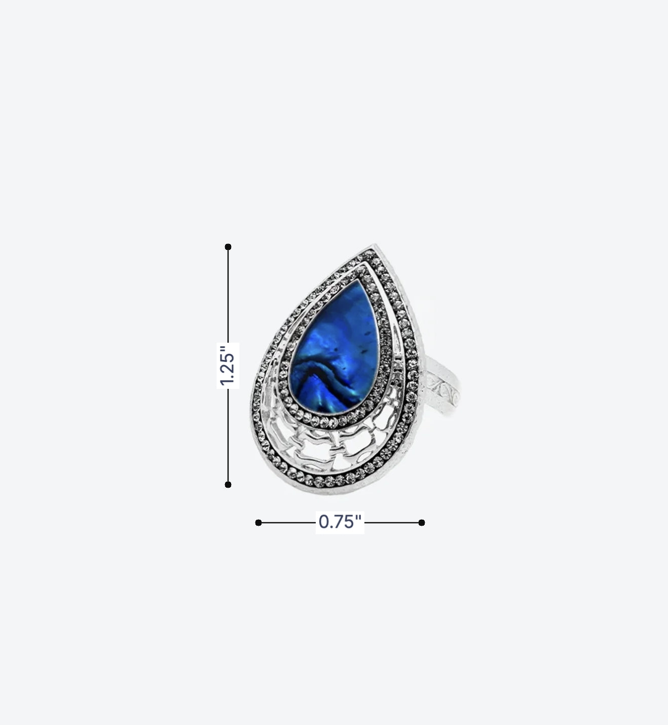 Experience the allure of the Vogue Gem Tear Ring, a statement piece crafted by European artisans. This captivating ring features a stunning teardrop-shaped gemstone, meticulously set alongside sparkling Swarovski® crystals. Intricate detailing and a blend of organic materials with luxurious crystals create a unique and eye-catching design. Whether you're dressing up for a special occasion or adding a touch of glamour to your everyday look, this versatile ring is sure to make a lasting impression. Indulge in the allure of handcrafted jewelry and elevate your style with this exquisite creation.