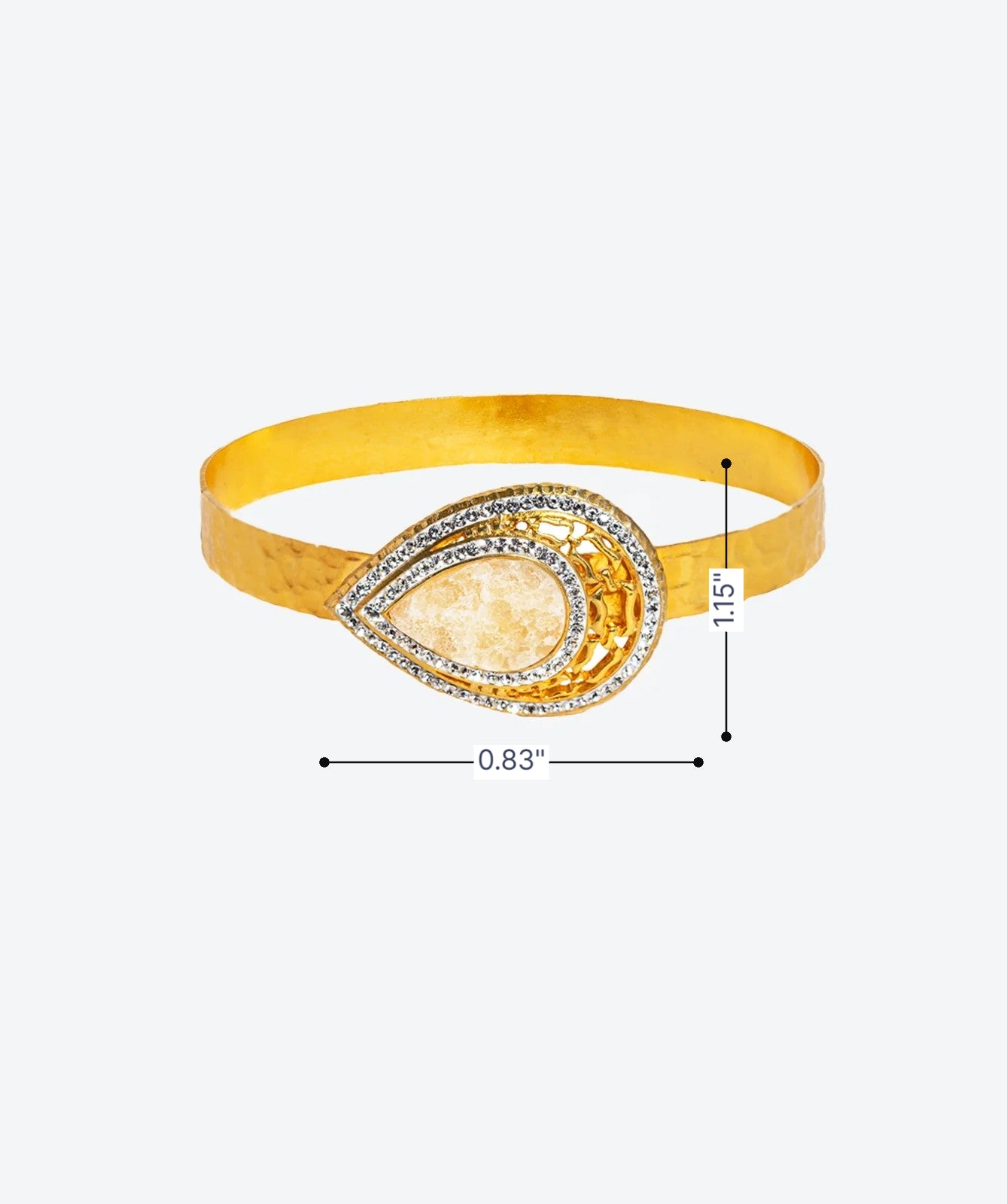 Elevate your style with the Vogue Gem Bangle Bracelet. This luxury jewelry piece showcases a captivating teardrop-shaped gemstone, meticulously set alongside shimmering Swarovski® crystals. The artfully arranged gemstones within an oval silhouette, combined with the beautifully textured, hammered gold band, create a truly unique and eye-catching design. Experience the harmonious blend of organic beauty and luxurious sparkle, a testament to European artisan design. This handcrafted gemstone bracelet is perfect for adding a touch of brilliance to any ensemble.  this bangle promises both elegance and comfort. Add this artisan statement piece to your collection today.