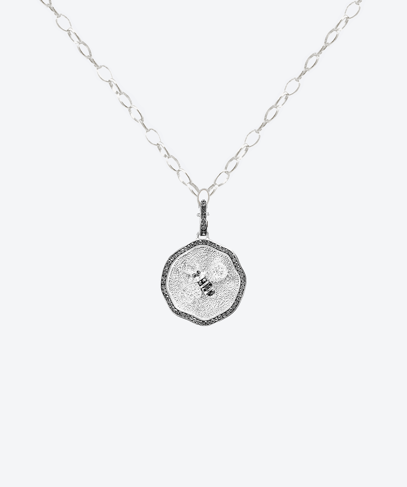 The medallion's unique, organic-edged contour is beautifully framed by a single row of small, brilliant dark crystals, creating a precise halo that enhances its distinctive shape and provides a halo of bold luminosity. The elegant bail, also adorned with dark crystals, connects the pendant to a chain of open, lustrous links. This piece elevates to the realm of true luxury jewelry. Meaningful and stylish, this necklace allows you to capture timeless elegance while keeping nature’s industrious beauty close to your heart.