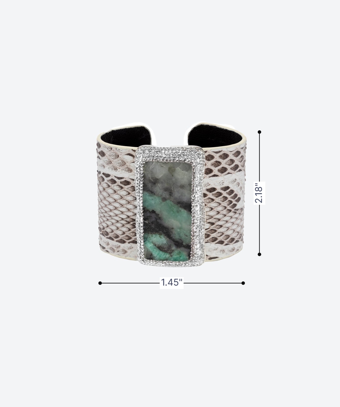 Capture bold elegance with our Exotic Statement Gem Cuff. This luxurious piece features a glamorous exotic leather band, centered with a striking rectangular gemstone, framed by sparkling crystals. The unique texture of the leather contrasts beautifully with the brilliance of the gemstone and surrounding crystals, creating a statement piece that exudes opulence. Handcrafted with meticulous attention to detail, this cuff is perfect for adding high-end glamour to any ensemble. Elevate your style with this rectangular gem surrounded brilliance.