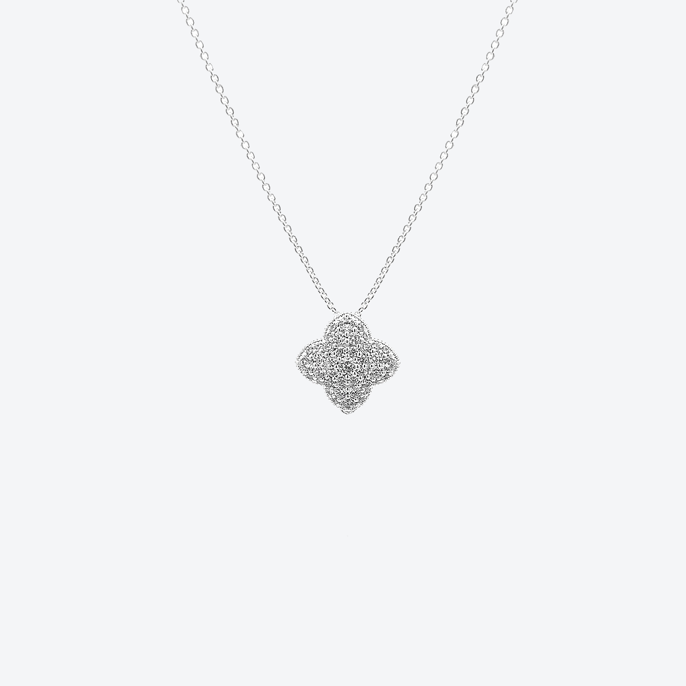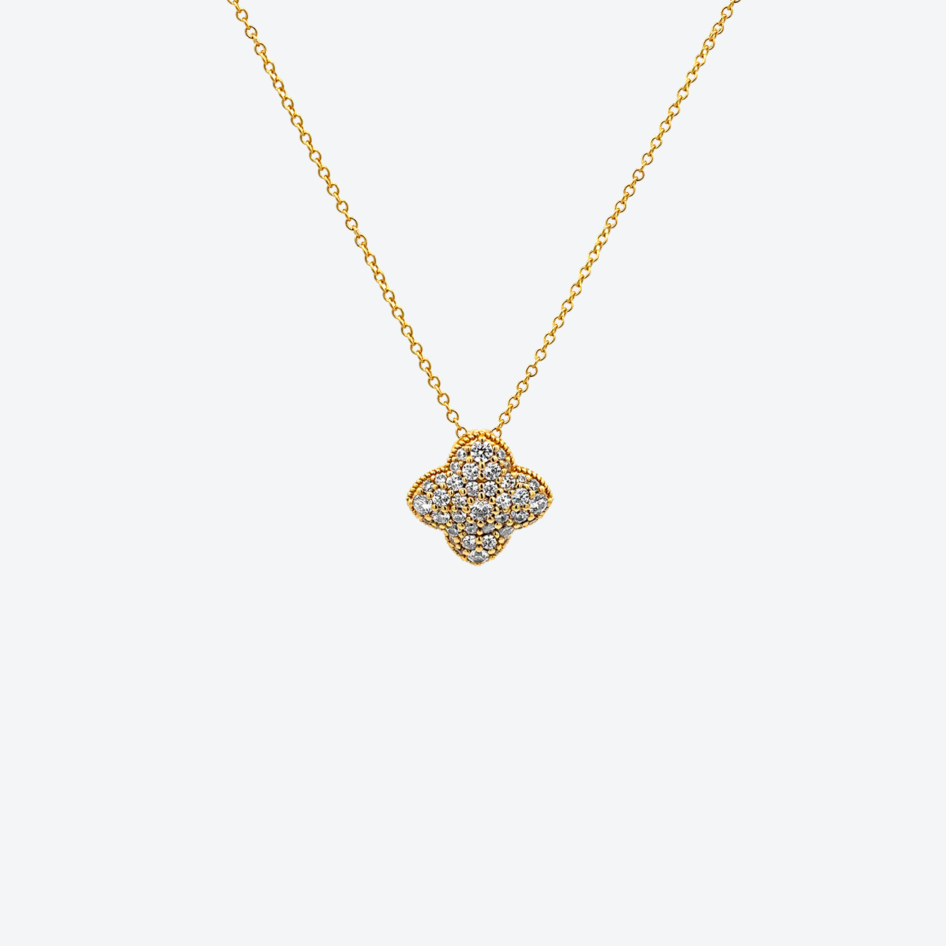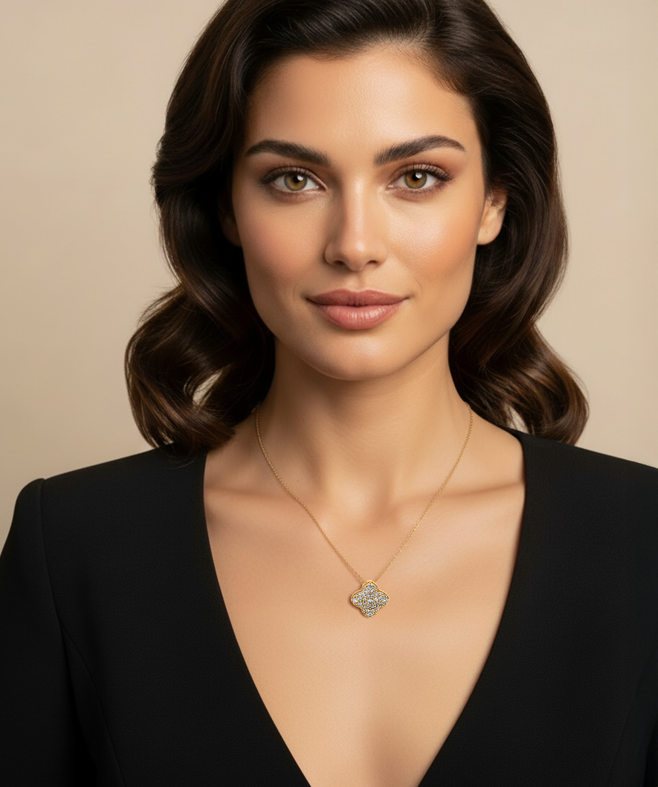 Indulge in the radiance of the Pave Flower Necklace, a masterpiece of European artisan craftsmanship. This captivating luxury necklace features a stunning flower-shaped pendant meticulously adorned with a dazzling array of Swarovski™ crystals, creating a breathtaking display of light and brilliance.