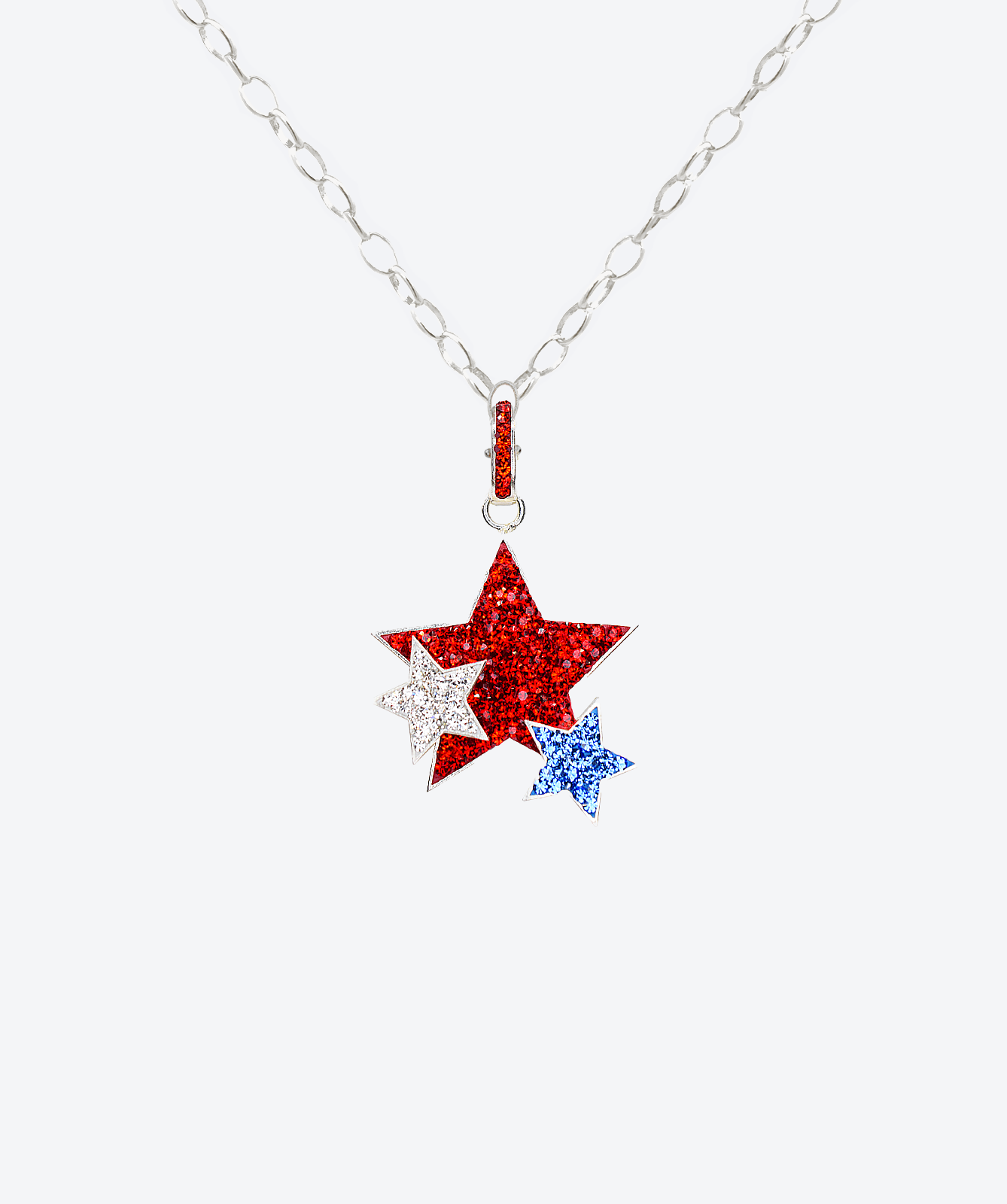 Flanking the center are two smaller, superimposed stars, also fully encrusted but featuring distinct hues to create depth and visual intrigue. This multi-dimensional piece embodies the playfulness of luxury jewelry while maintaining sophisticated elegance. For everyday glamour, add a touch of brilliance to your ensemble with this sparkling constellation that demands attention.