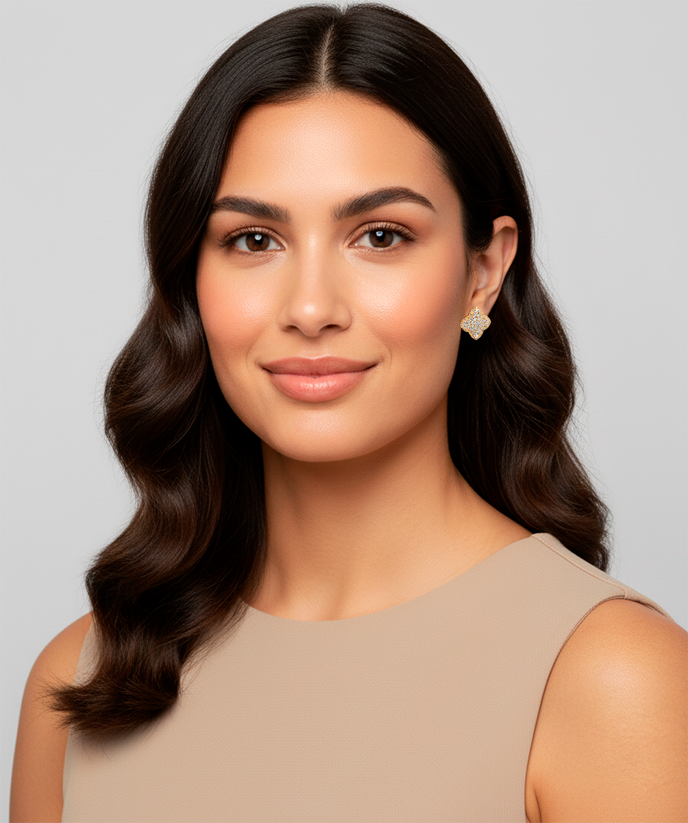 These sparkling earrings are covered in Swarovski crystals and shaped like the quatrefoil, a timeless symbol that has influenced design for centuries. The name itself, meaning "four leaves" in Latin, connects the design to the idea of good luck, much like a four-leaf clover. Its significance, however, is much deeper. Across cultures, the quatrefoil holds great meaning: in Christianity, it often symbolizes the four evangelists (Matthew, Mark, Luke, and John), while in Native American tradition, it represents the four cardinal directions (North, South, East, and West).