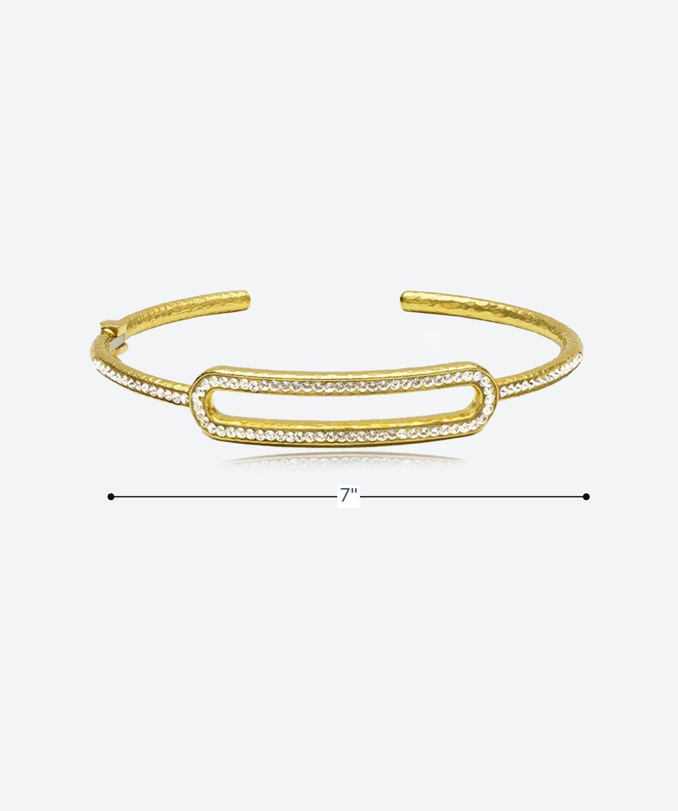 Capture refined elegance with our Link Tennis Bangle Bracelet. This unique piece features an open, dainty hammered bangle, designed to adjust perfectly to your wrist size. The elongated open link, channel-set with sparkling crystals, extends down each side for a complete crystal look. Handcrafted with European artisan precision, this bracelet offers a blend of modern design and timeless sparkle. Elevate your style with this hammered crystal channel bracelet.