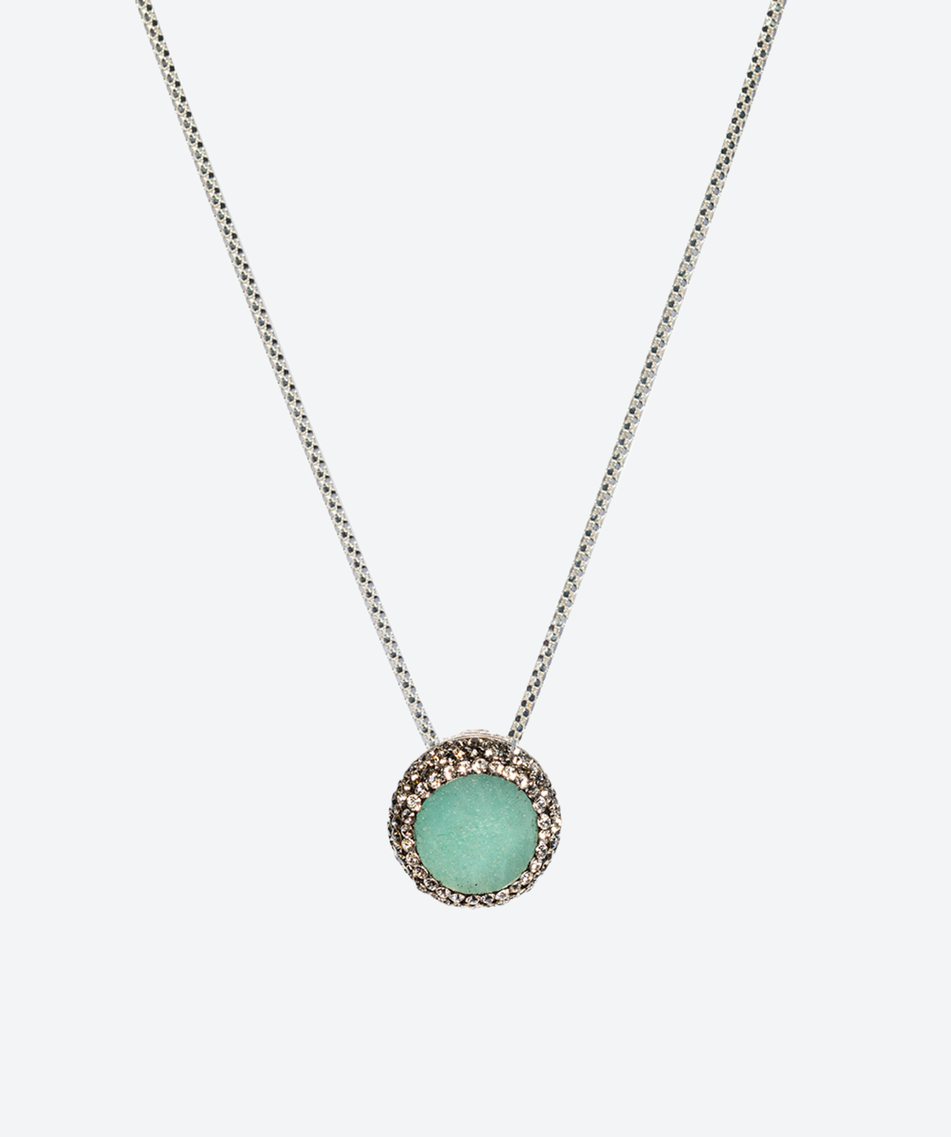 To elevate the central stone, it is embraced by a luxurious double halo. Two concentric rows of small, brilliant crystals frame the gem, creating a sparkling border that catches the light from every angle. This exquisite balance of smooth stone and shimmering crystal defines the essence of luxury jewelry. Capture timeless elegance and add a subtle yet stunning touch of brilliance to your neckline with this versatile treasure.