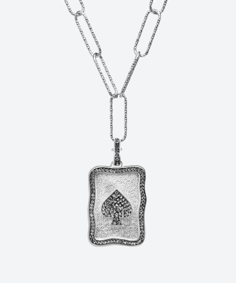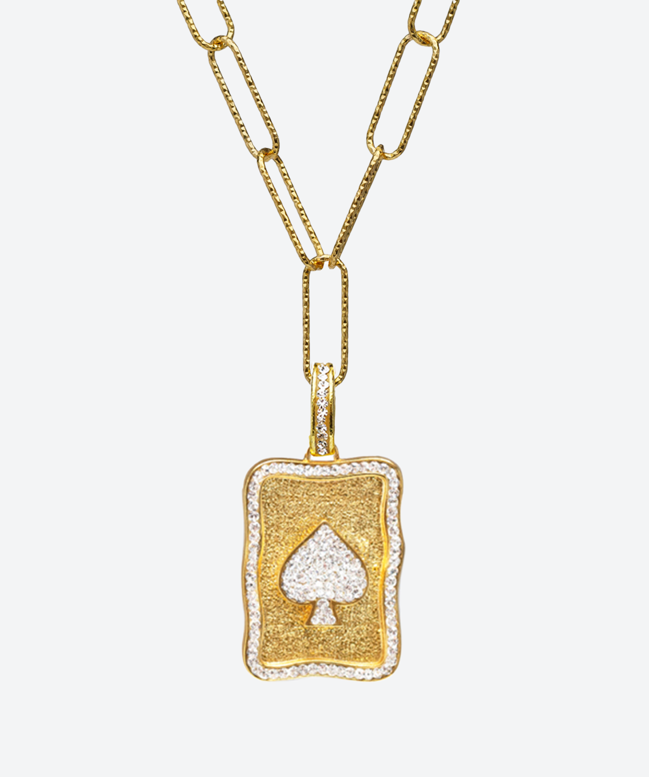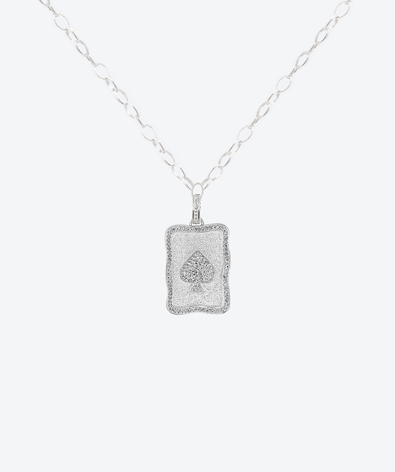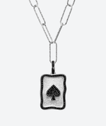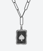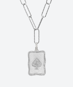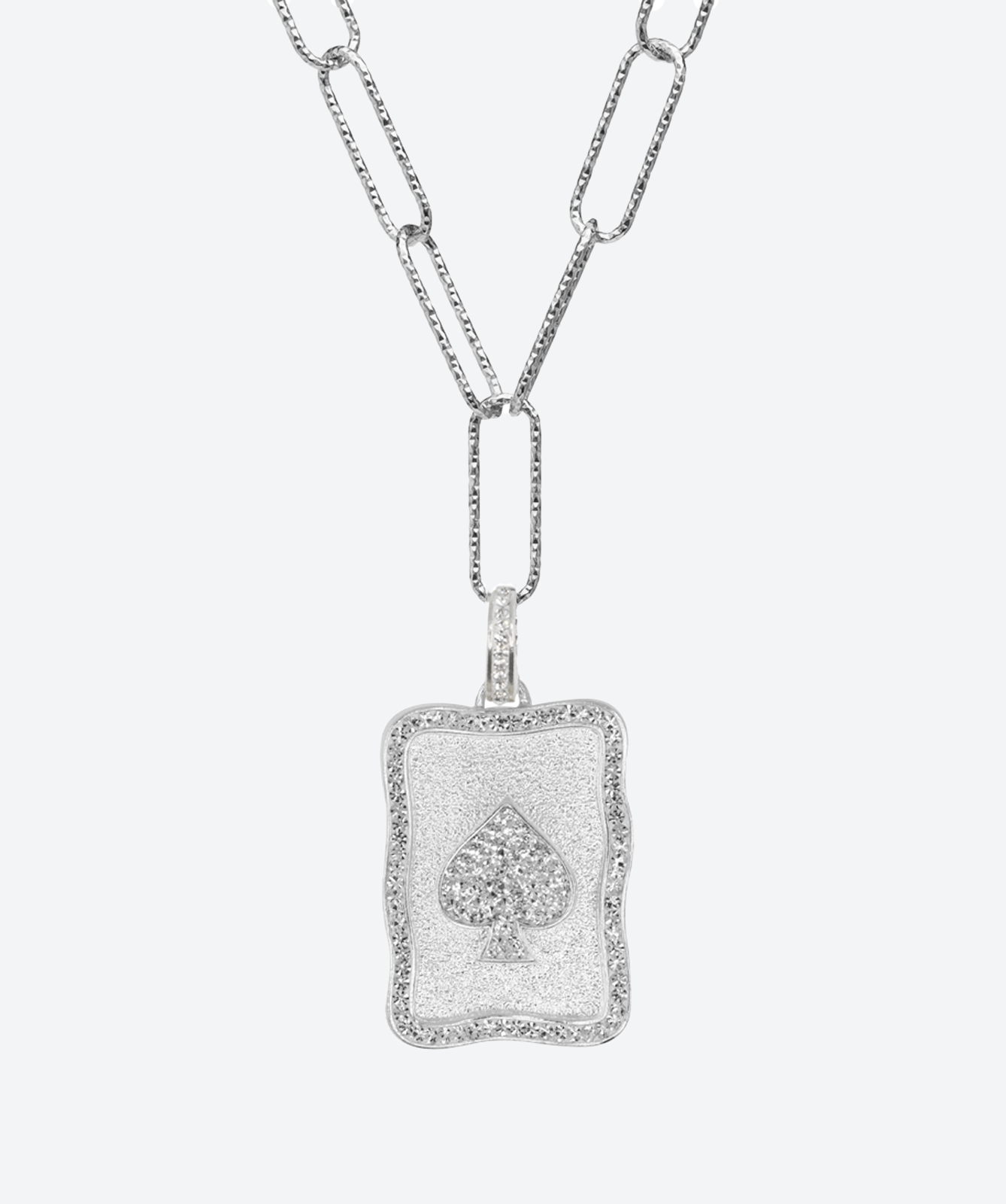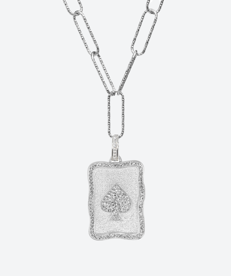 The centerpiece is a striking spade motif, completely encrusted with small, brilliant crystals that command attention against a granulated, subtly sparkling background. To maximize the radiance, the outer border and bail are meticulously lined with a row of precision-cut stones. Suspended from a trendy chain with open oval links, this necklace defines luxury jewelry with an edge. Elevate your style and carry a token of luck with this dazzling, conversation-starting accessory.