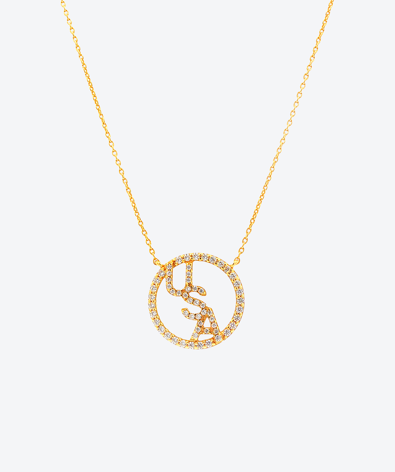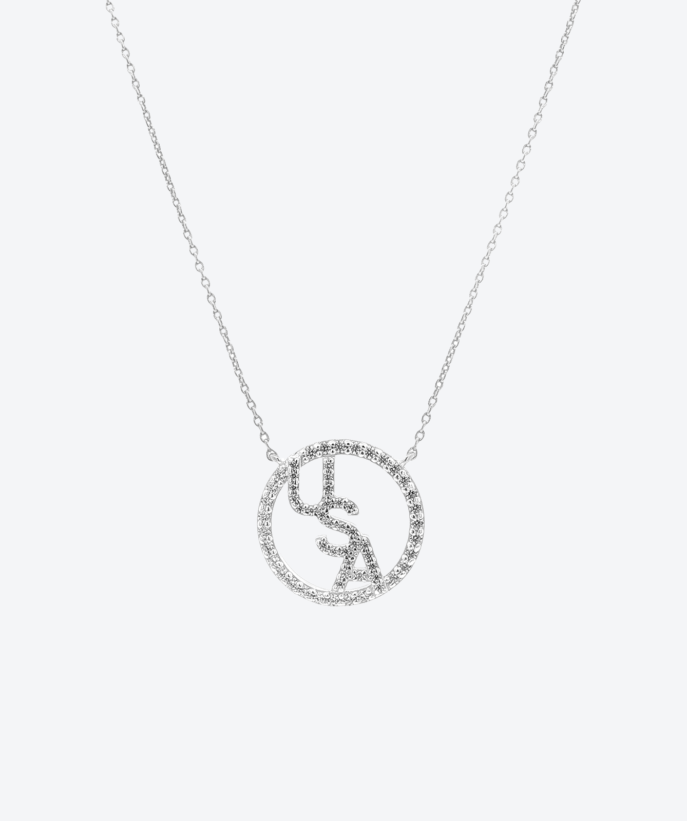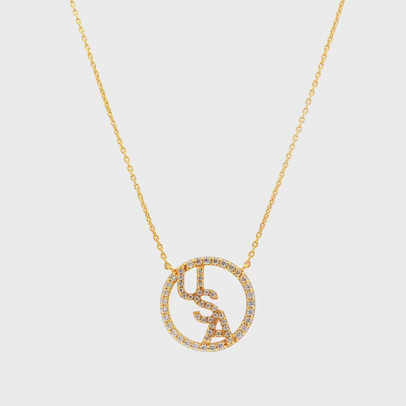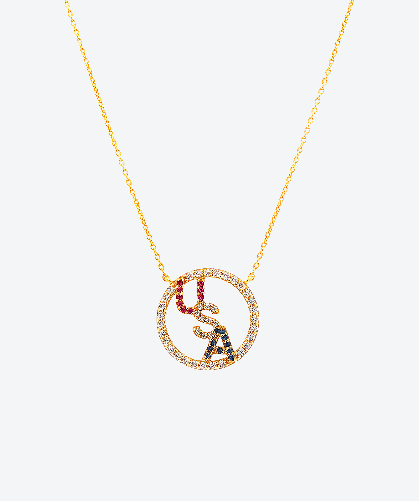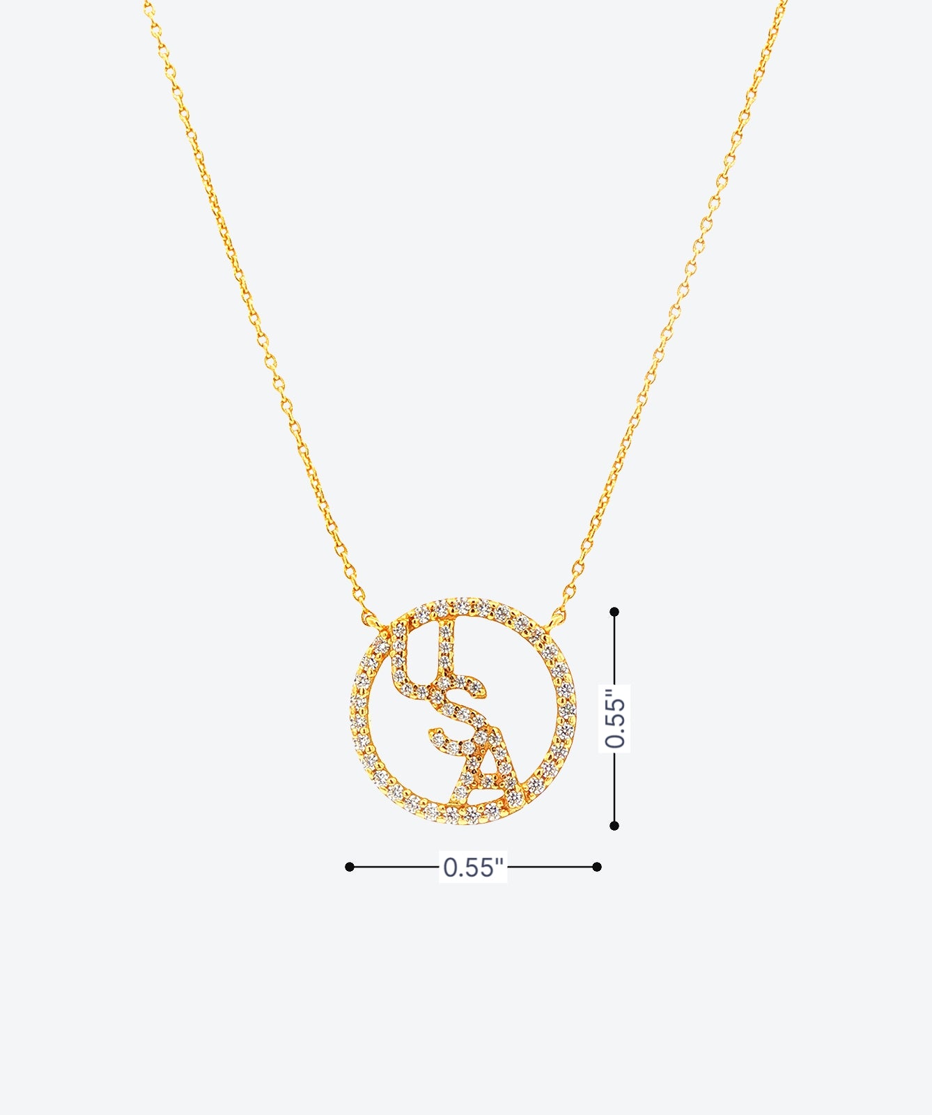 The pendant features a delicate, thin-profile circular hoop that serves as a sophisticated foundation for its central motif. Inside the frame, the "USA" initials are arranged in a stylized, vertical layout, creating a modern openwork effect that seamlessly blends contemporary fashion with timeless pride.